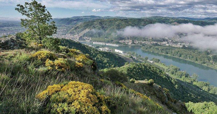 avec son fleuve prédominant avec ses teintes de bleues variant au fil de saisons. De part et d'autres, les côteaux viticoles prestigieux de nos trois nobles appellations, Hermitage et Crozes côté Drôme, et Saint Joseph côté Ardèche ;